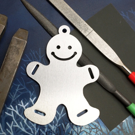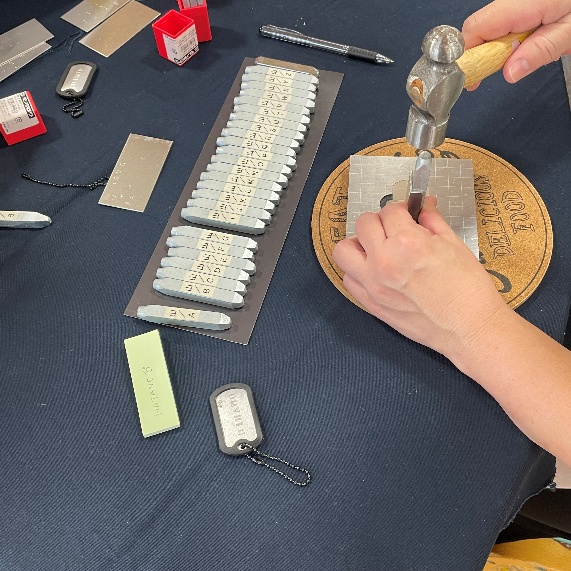 ジンジャーマンの形をした金属に好きな文字を打刻して、オリジナルのキーホルダーができます。